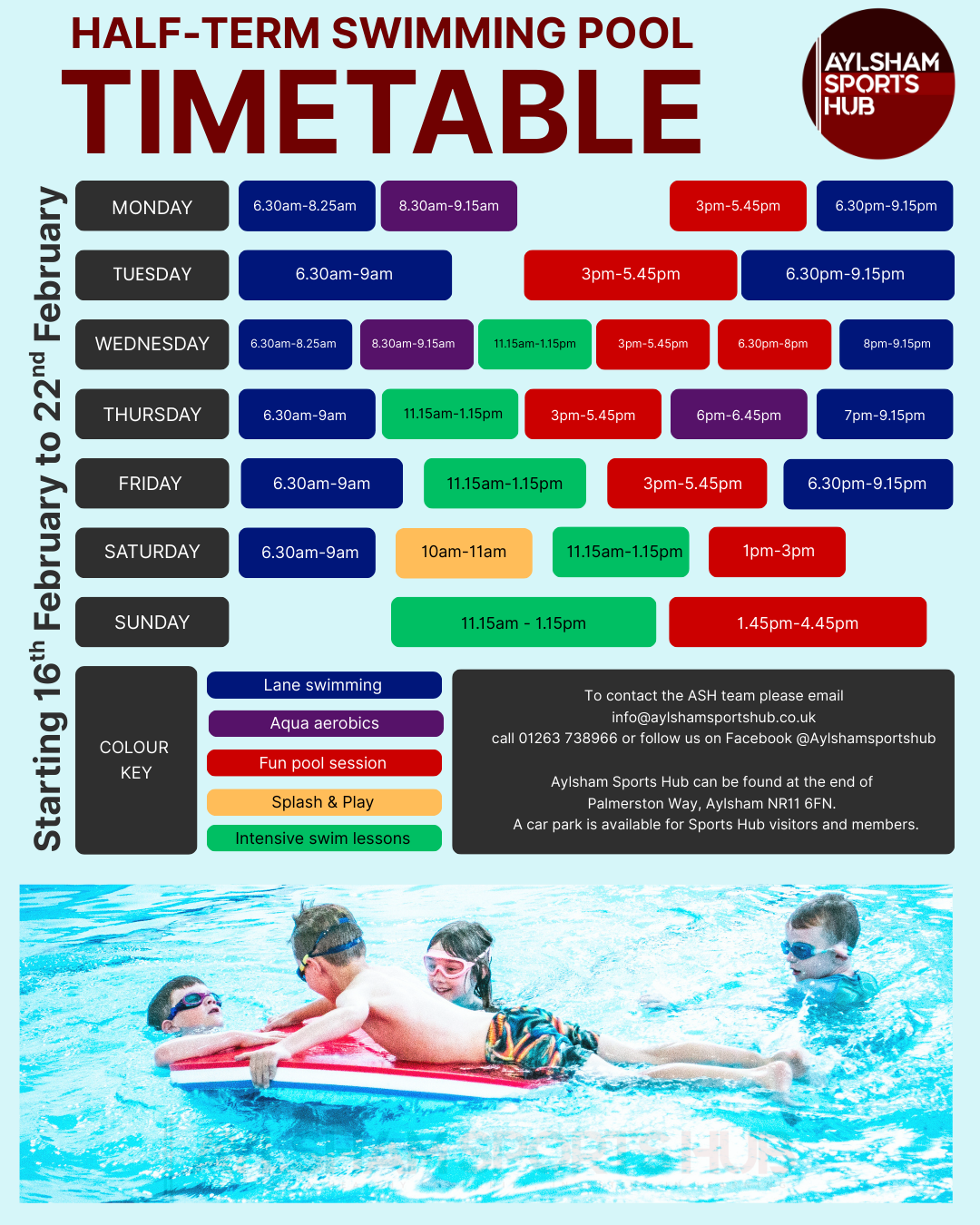 Lane swimming and aqua classes will also be taking place. Please see below our timetable for swimming sessions over the half-term holiday (a downloadable version of the timetable can be found at the end of this webpage).
