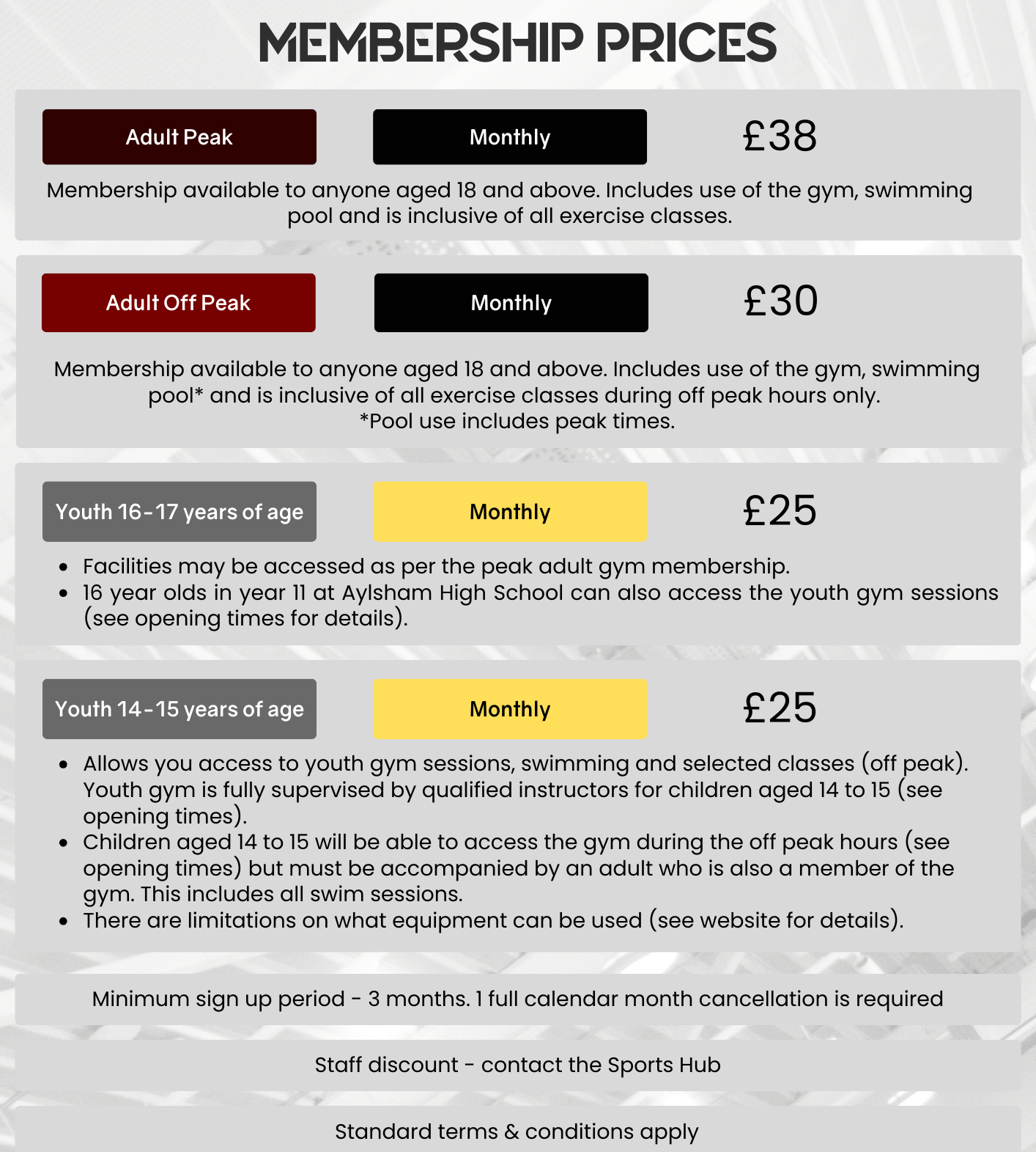 - Full adult membership of Aylsham Sports Hub will be £38.00 per month. This price includes use of the gym, swimming pool and is inclusive of all exercise classes.