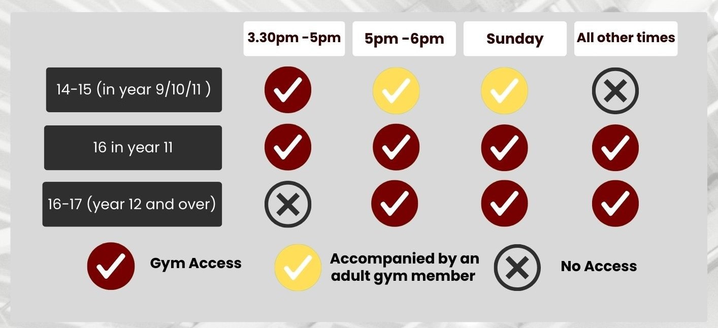 This membership allows unaccompanied access as adult membership whenever the gym is open. For 16 year olds still in year 11 they will also be able to access the instructor supervised session between 3.30pm and 5pm.