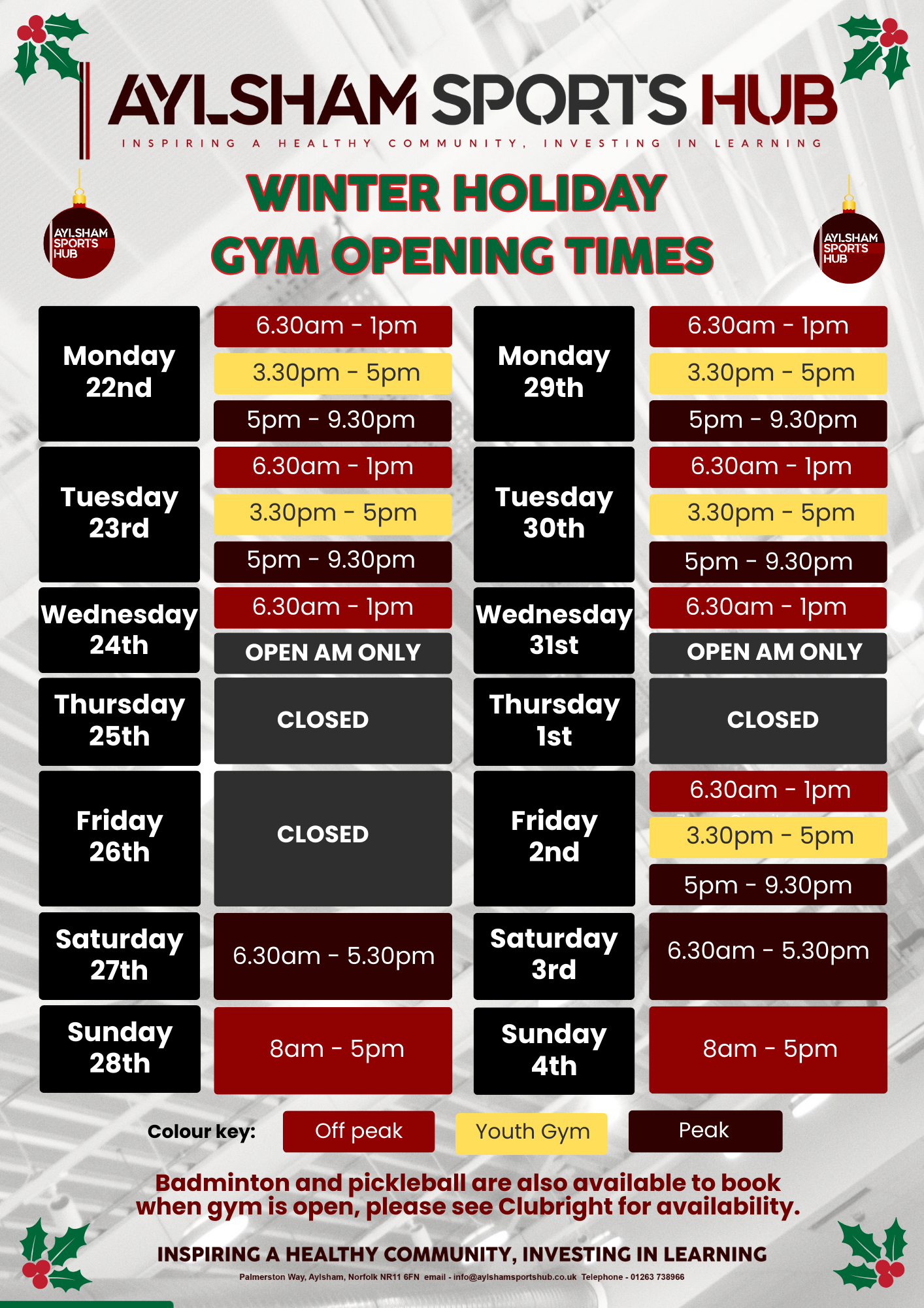 Badminton and pickleball courts are available to book over the holiday period for £9 for an hour. Please see Clubright for availability (please click here).
