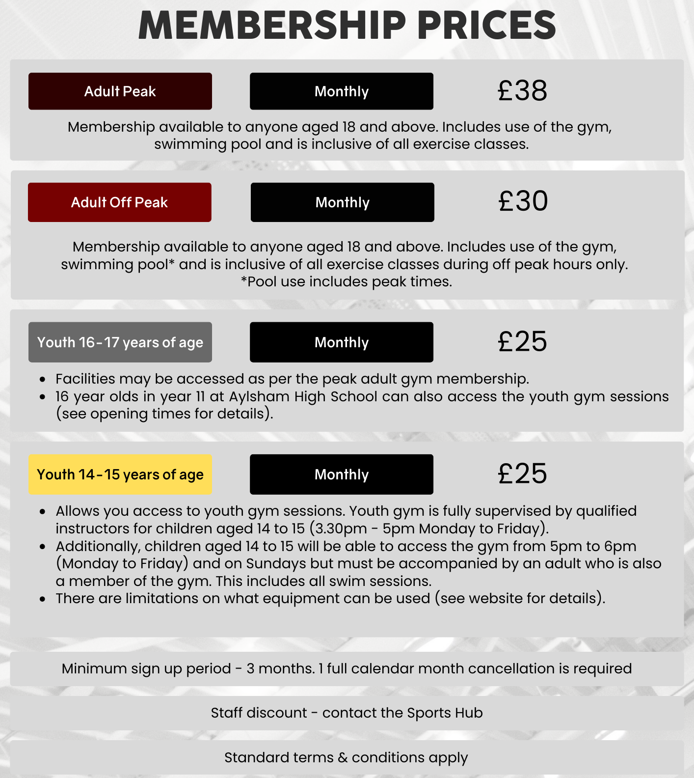 - Full adult membership of Aylsham Sports Hub is £38.00 per month. This price includes use of the gym, swimming pool and is inclusive of all exercise classes.