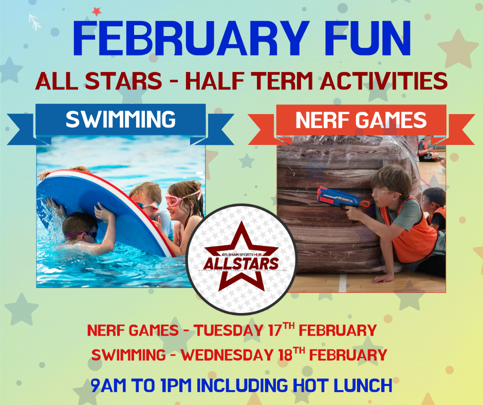 Our All Stars team will be running instructor-led Nerf Games and swimming sessions from 9am to 1pm on the following dates: