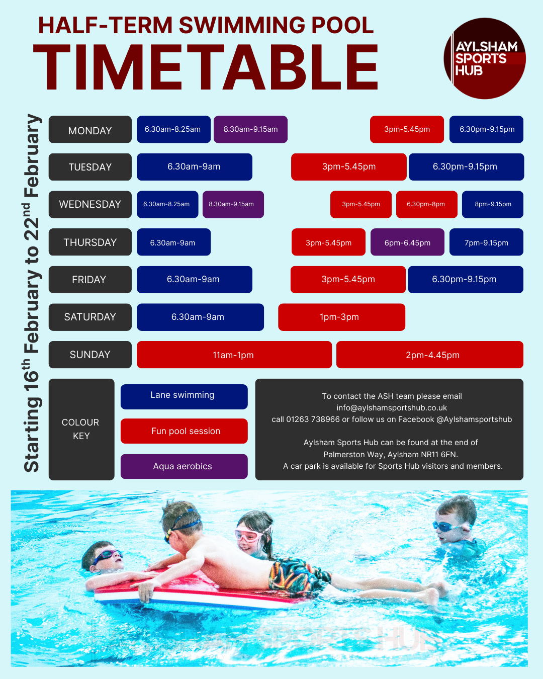 If you have any questions or need help with registration, feel free to contact us at swimschool@aylshamsportshub.co.uk or call 01263 733270 (ext. 221).