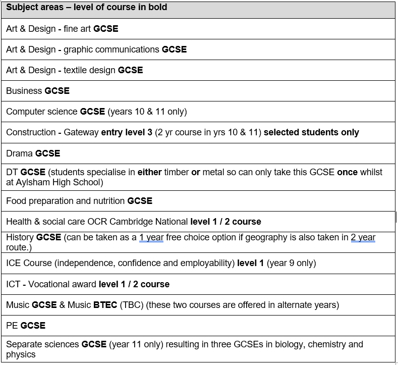 Below is a list of the option subjects on offer at Aylsham High School. These courses are taken in years 9, 10 and 11. Option lessons take place on a Tuesday and Thursday. The level of the course is highlighted in bold. We are unable to guarantee which year an option will be assigned.